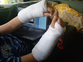 Peter went through a class door and cut his right arm very badly. He has 40 staples and cut all the tendons. Luckily he did not cut any nerves or the main artery. He also cut the tendon on the left side of his left hand. So he can't do a thing!!! Mom and sister have to do everything for him. Needless to say he has managed to find a way to work on the computer. He cannot bend his wrists so it is not easy.